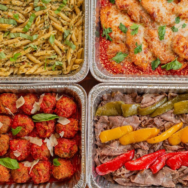 We offer a full selection of Italian dishes for catering, including pizza, pasta, appetizers, salads, entrées, and desserts. Our catering trays come in half trays (serves 8–10) and full trays (serves 18–20), with house-made focaccia garlic bread and all necessary extras.